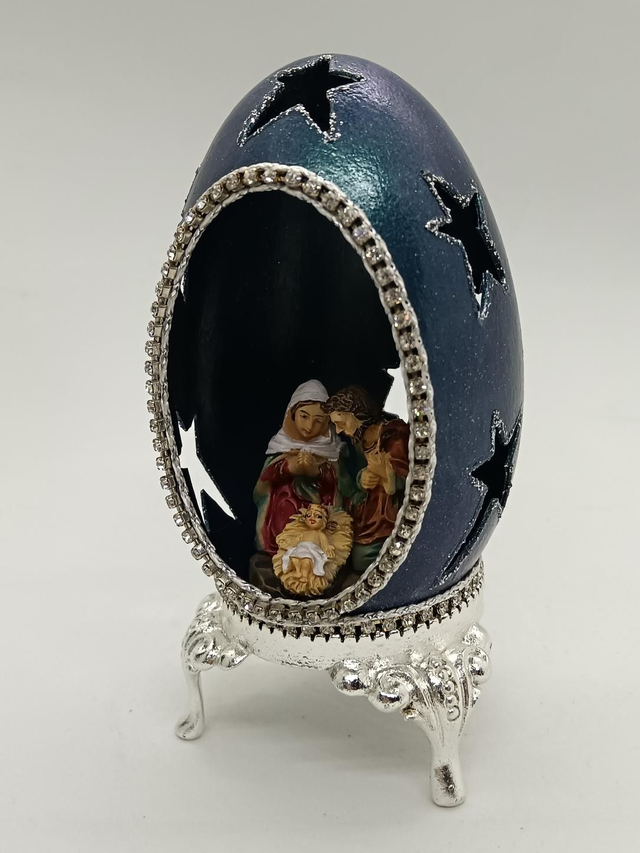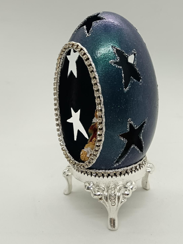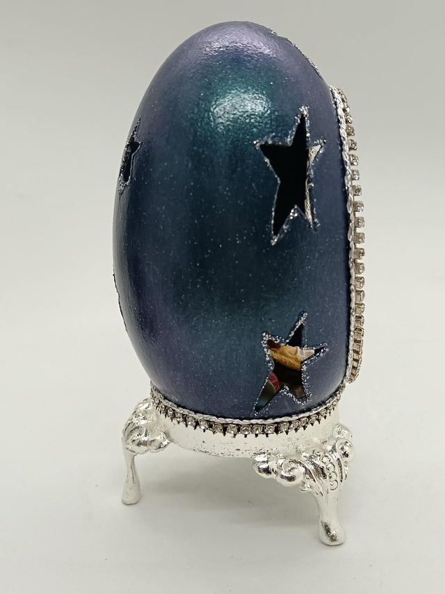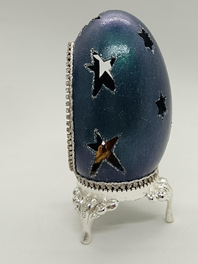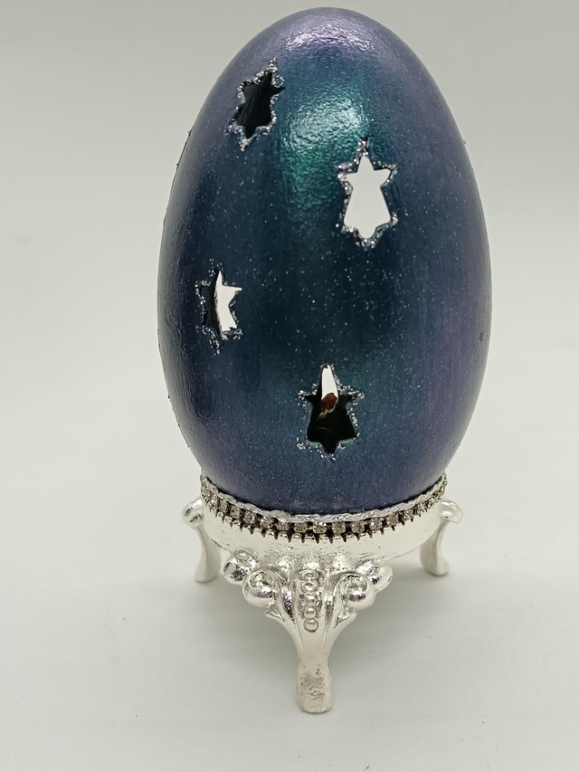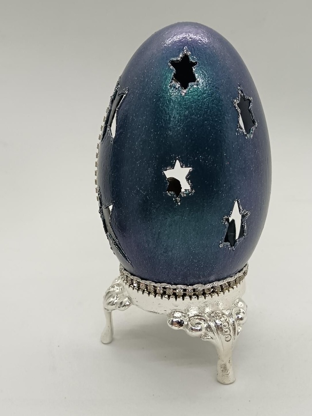 Blue Goose egg with star's cut out on a silver stand
