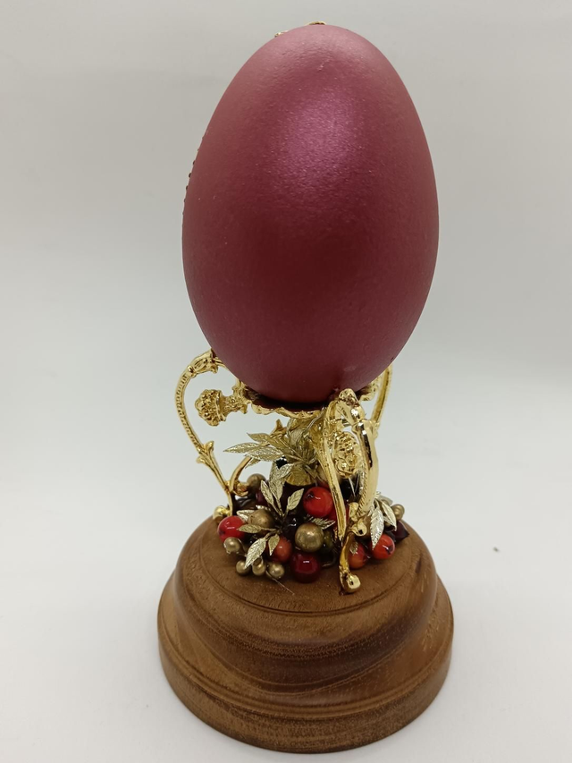 This egg sits on a gold plated stand that is attached to a hardwood base.
