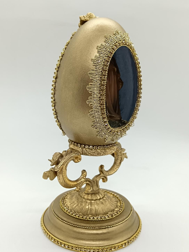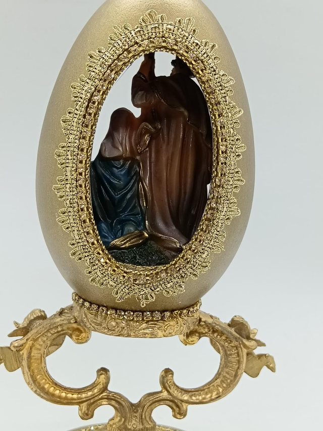 Golden goose egg with a beautiful hand painted nativity scene inside.