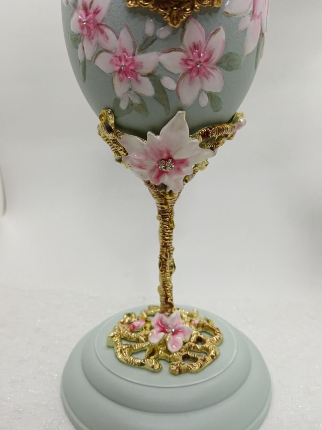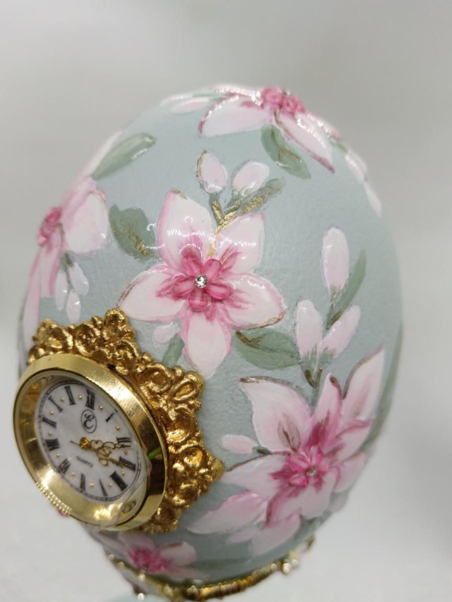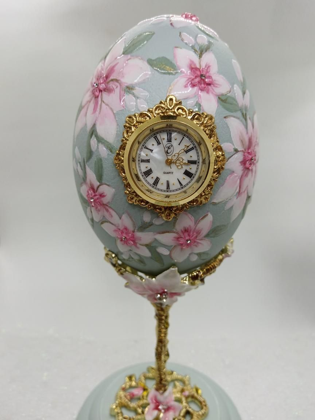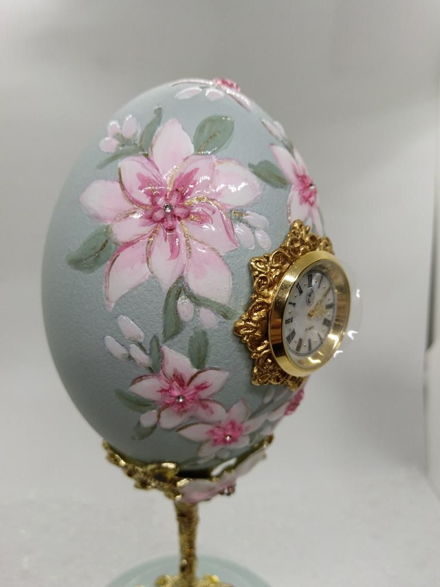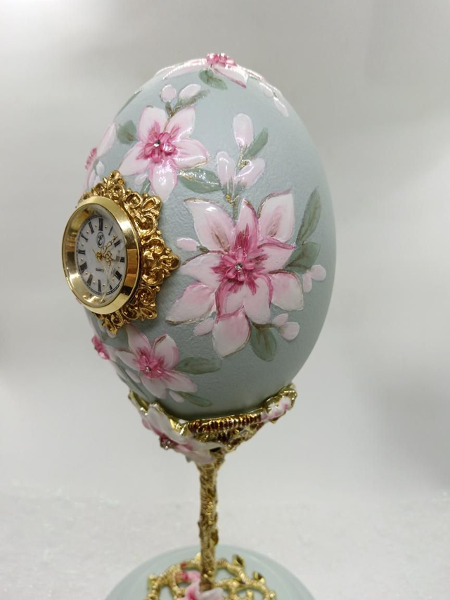 Hand painted Rhea egg Clock with Enamelled stand