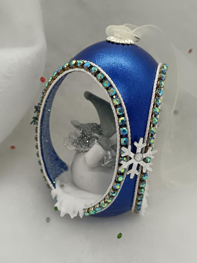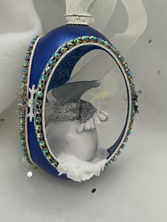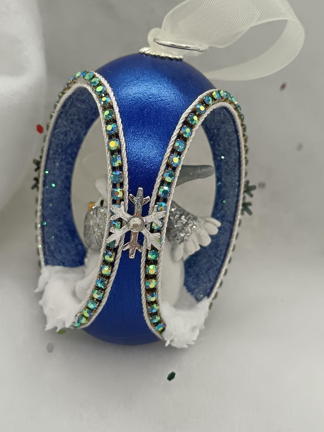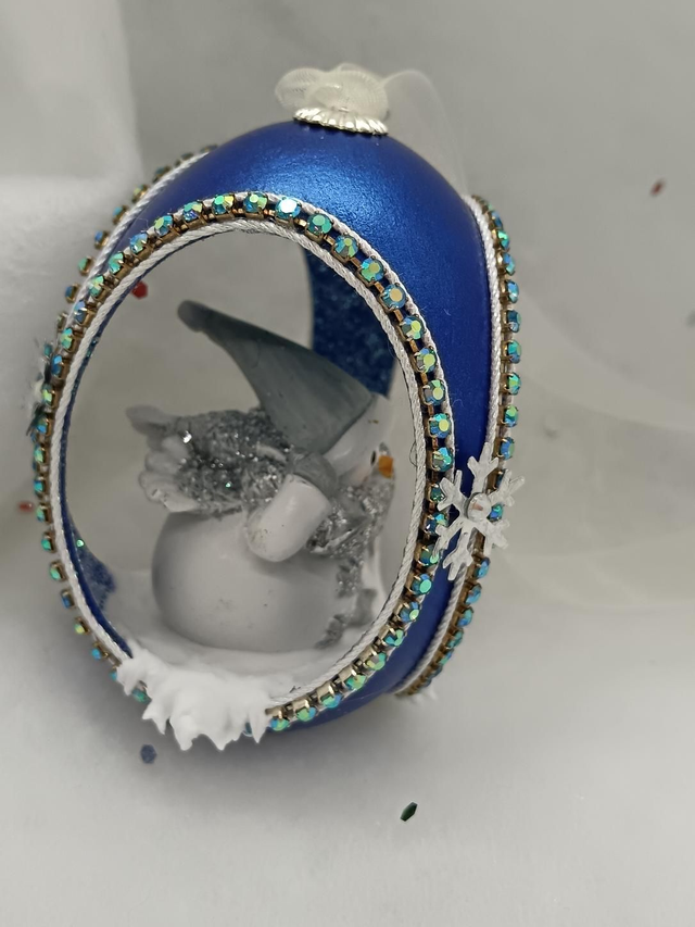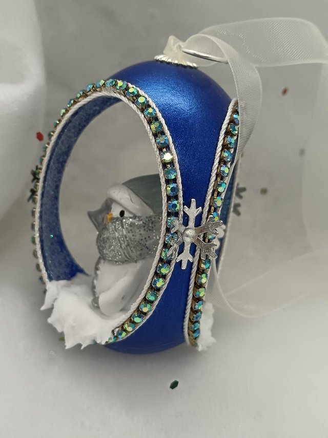 Metallic blue Duck egg with 3 openings adorned in crystal chain. Has a cute silver and white snowman in white snow.