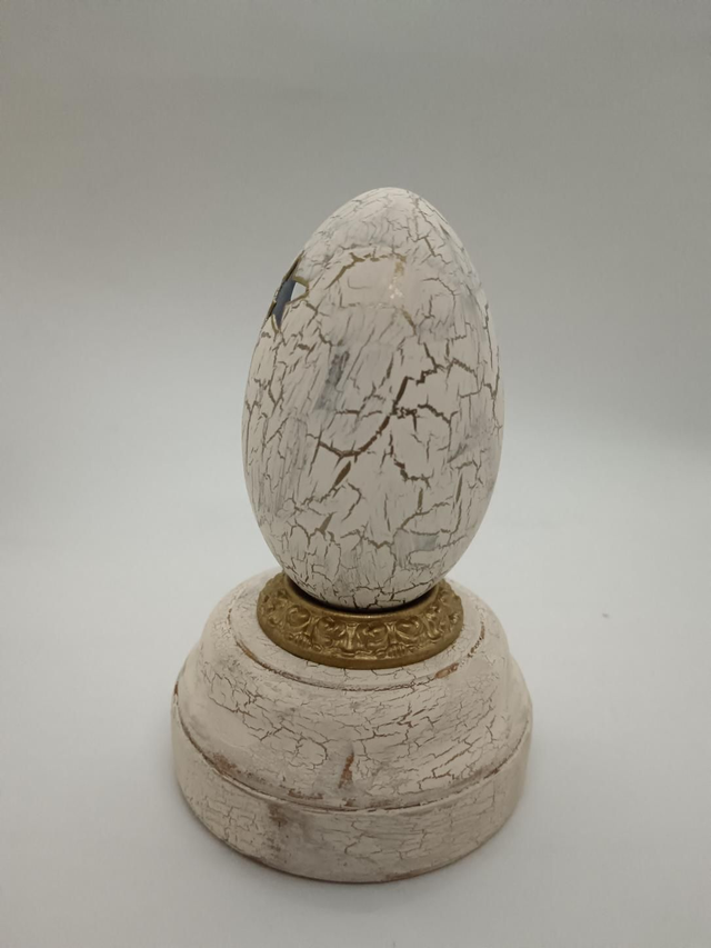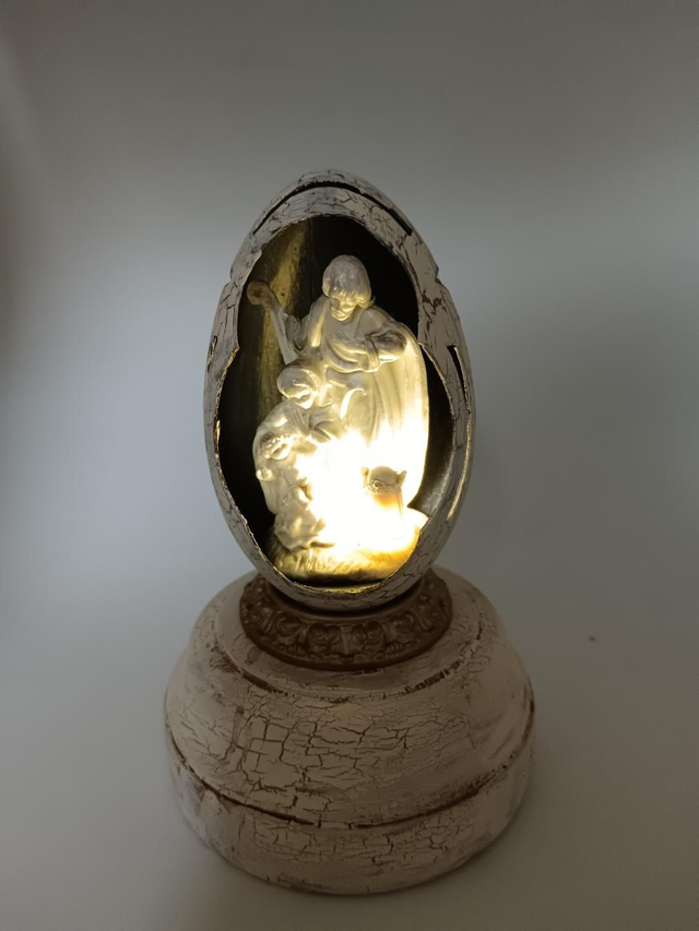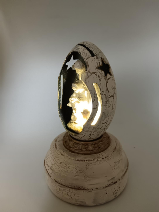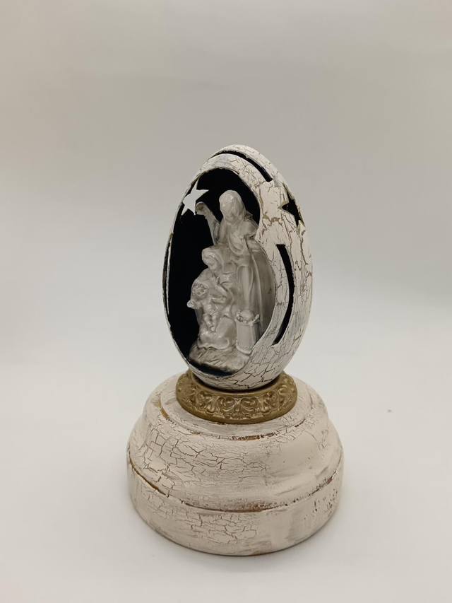 Light up nativity scene in a Goose egg with cut out star's and design. Sits on a painted wooden base that holds the battery compartment and switch.